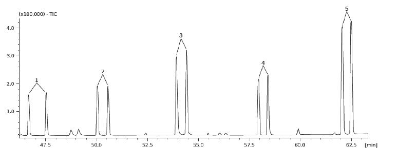 進樣口:分流 250℃ , 0.5 μL, 1:50