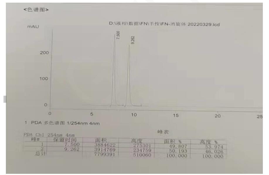 色譜柱 2:Chiral INC 3μm 250×4.6mm (FMG-JY3-I03) 流動(dòng)相:反相(咨詢銷售代表) 流速:0.9 ml/min 進(jìn)樣體積:10 μL 檢測(cè)波長(zhǎng):251nm 柱溫:30℃