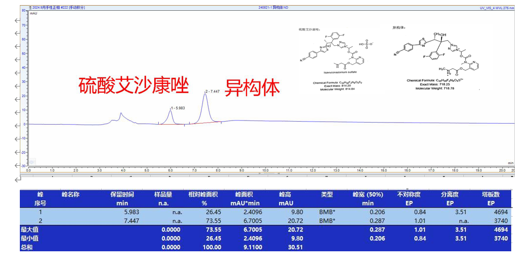 App ID: FLM-B240015 硫酸艾沙康唑及其對映異構(gòu)體的手性拆分 色譜柱:Chiral ND(2) 5u 250*4.6mm (P/N: FMG-AC5-A01-NFC) 流動(dòng)相:正相(咨詢) 柱溫:25℃ 流速:0.8 mL/min 檢測波長:275nm 濃度:N/A 溶劑:30%乙腈 圖譜 1: