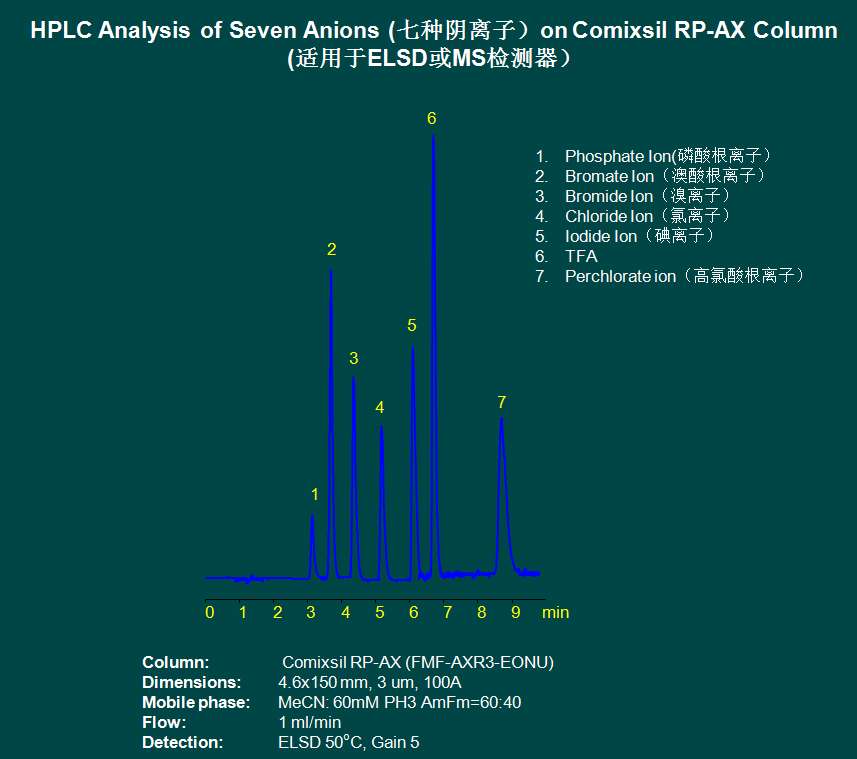 七種陰離子檢測(cè)(基因毒性和元素雜質(zhì)相關(guān)應(yīng)用圖譜)菲羅門液相柱