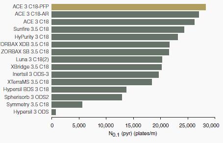 ACE C18-PFP由于其超惰性性質而達到了最高塔板數(shù)。